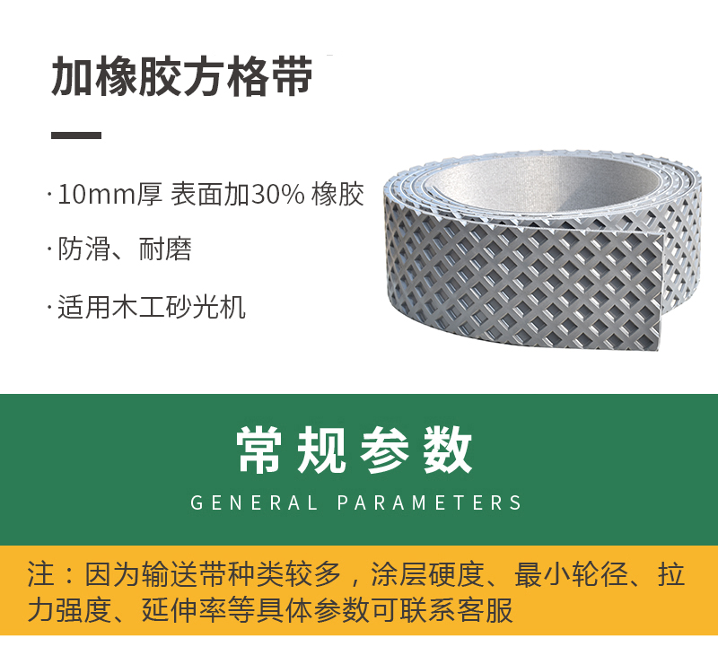 小方格纹输送带 PVC材质,表面加30%橡胶,具有耐磨、防滑的特点,适用于木工行业砂光机中。